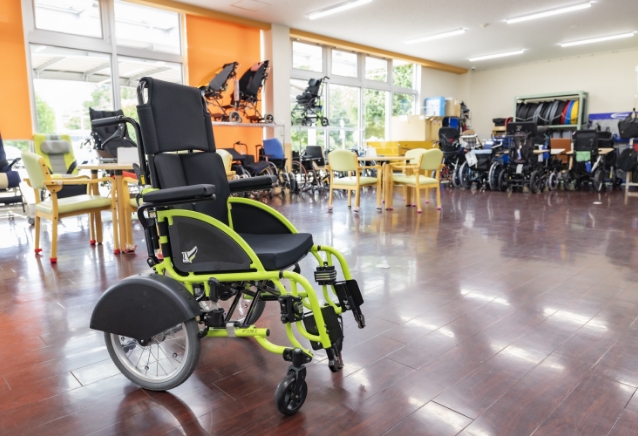 さまざまな車いすを展示しており、実際に車いすやクッションを体験できます。奥には車いすのメンテナンススペースもあります。