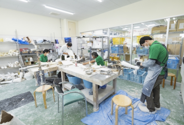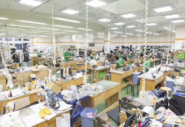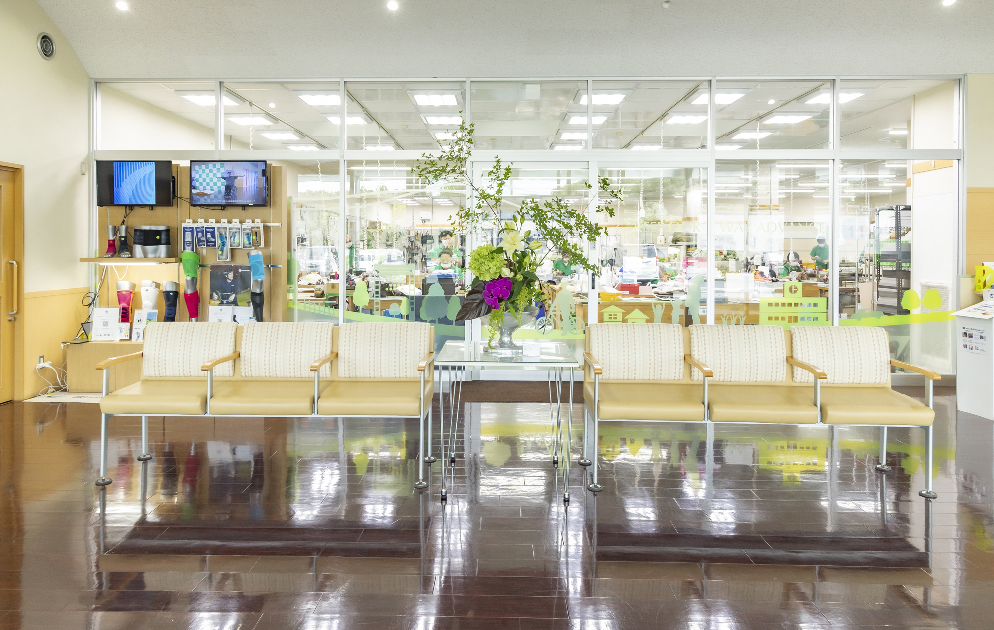 エントランスホール正面に製作室があり、ガラス越しに製作現場の様子をご覧いただけます。フロア面積400m2、国内屈指の広さを誇る義肢・装具の製作室で、室内のレイアウトは社員同士のコミュニケーションが活発にやり取りできる配置です。