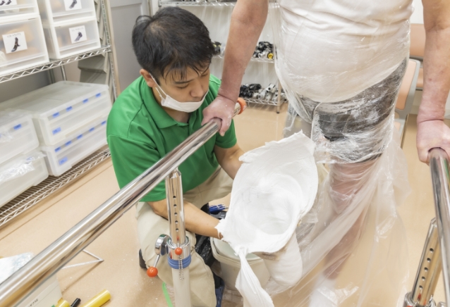 型取りをした石膏モデルをもとに、筋肉のつき方や神経の場所を考慮し、矯正や安静などの使用目的に合ったモデル修正を行います。