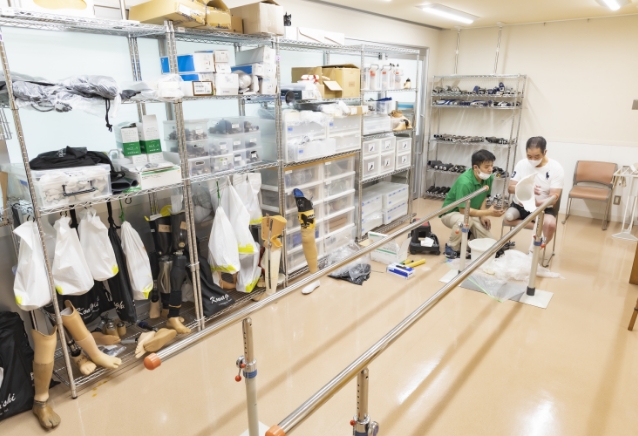 各メーカーの足部や膝のパーツを揃えており、平行棒を使って義足の試し歩行をすることもできます。