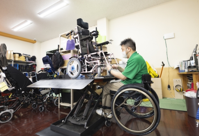 車いすのメンテナンススペースにある、自動で昇降する作業台。重量のある車いすでも、作業台の高さを変えることで調整や修理が可能です。