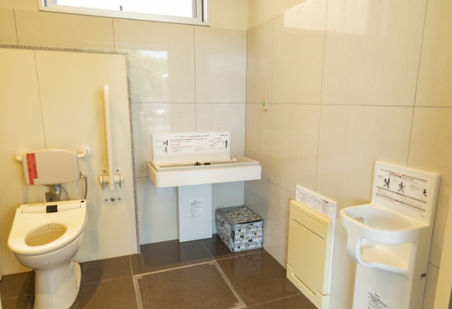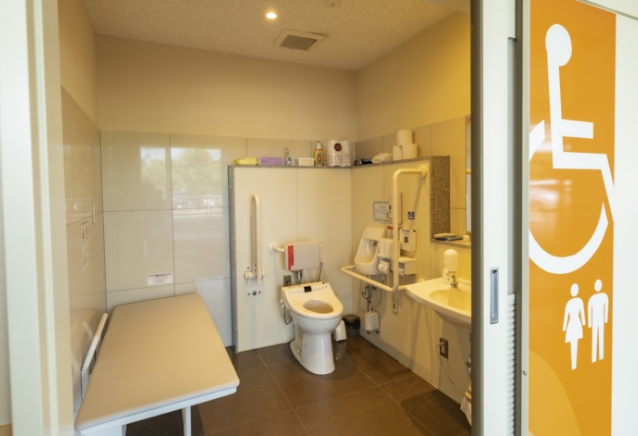 エントランス右手にある多目的トイレには、赤ちゃんのオムツ交換台とベビーチェアがあります。お子さん連れでも安心して利用できます。
