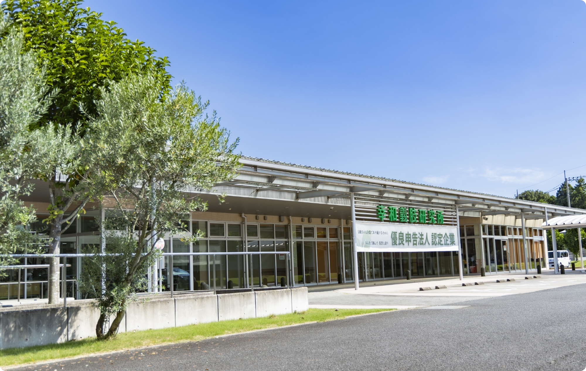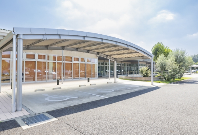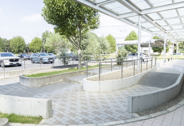 玄関前は屋根付きのロータリーになっており、ドアの近くに車を寄せられるようにしています。車いすもご用意しています。