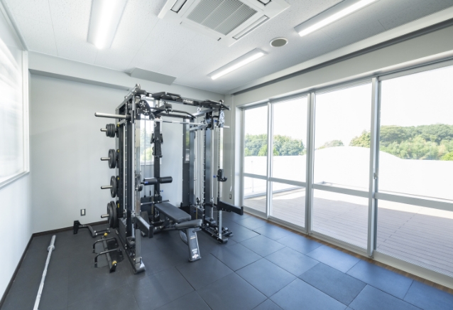 トレーニングマシーンを備え、体力作りを支援しています。月に2回フィットネストレーナーによる指導が受けられます。
