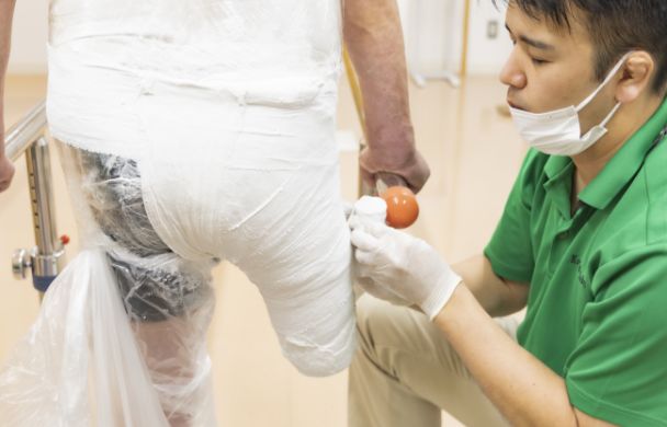補装具製作のための計測を石膏などを用いて行う。